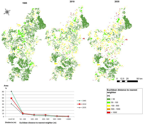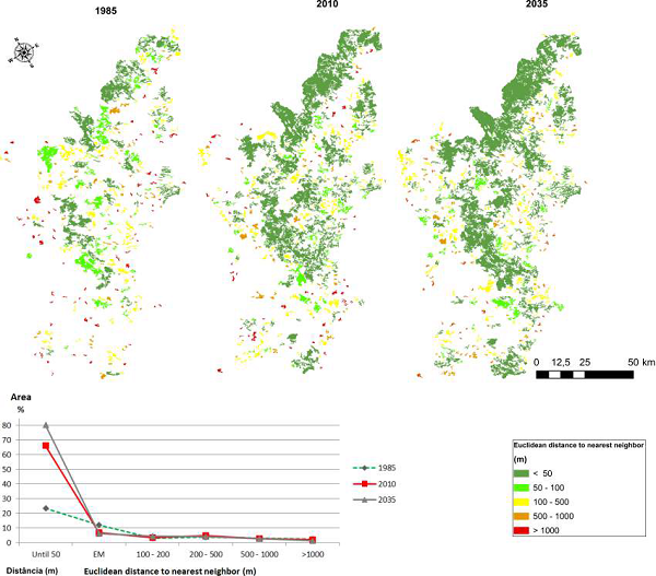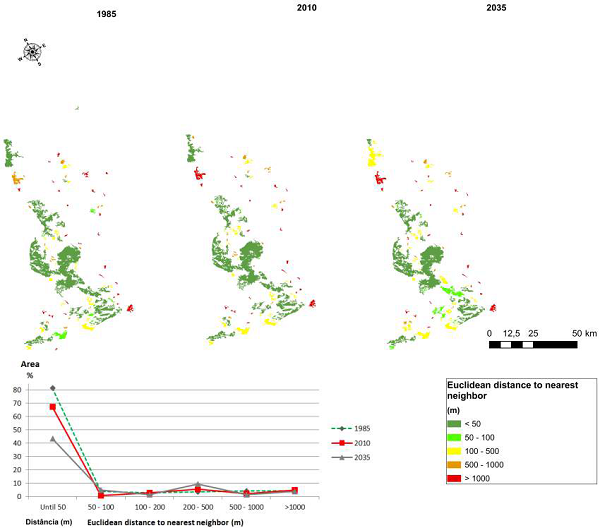 The maps and the graph in Figure 11 show the evolution of patch isolation in the MountainEcological Refuge class over time. This is the class that has altered the least and also demonstrated atendency for increased patch isolation. The greatest variation for this indicator is in the distance range of50m. In 1985, more than 80% of the patches in this category were concentrated within this 50m range.In 2010, this number had decreased to a little over 70%, and in 2035 it is expected that only 60% of thepatches will be located less than 50m apart from each other.