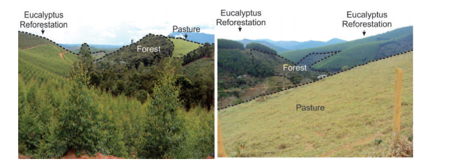 The current landscape is mainly covered by pasture, eucalyptus reforestation, and forest, as shown in the photos in Figure 2 taken during fieldwork in 2013.