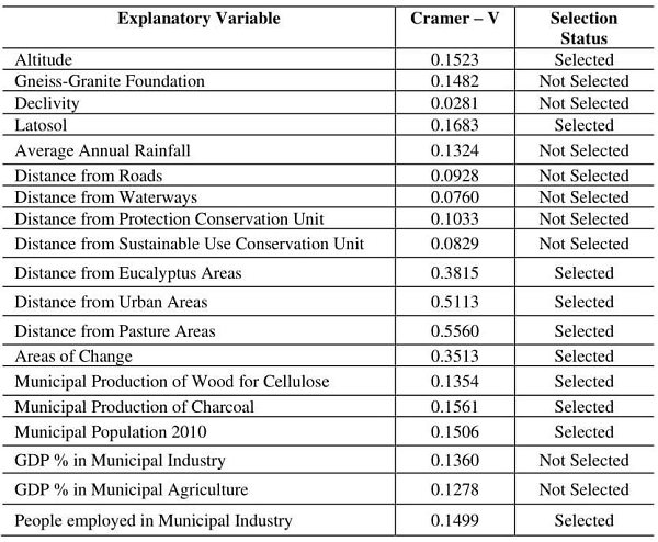 The pertinent transitions and the descriptive variables of land cover change presented in Table 2were used to calibrate the model for training a neural network (Multi-Layer Perceptron Neural Network– MLPNN – HAYKIN, 2001) that identifies the patterns of change. The Cramer-V spatial associationtest was employed to select the variables: (LIEBERTRAU, 1983). This is a non-parametric statisticaltest, which measures a variable’s importance in explaining a particular land cover change (EASTMAN,2009).