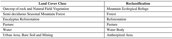 The landscape structure analysis was carried out for mapped (1985 and 2010) and simulated(2035) land cover. The categories were grouped together and reclassified as shown in Table 7. Thisreclassification grouped Outcrops of Rock and Natural Field Vegetation into Ecological MountainRefuge and Urban Area, Exposed Soil and Mining into Anthropized Area. This was done because allthese classes play a similar role in the composition of the landscape.