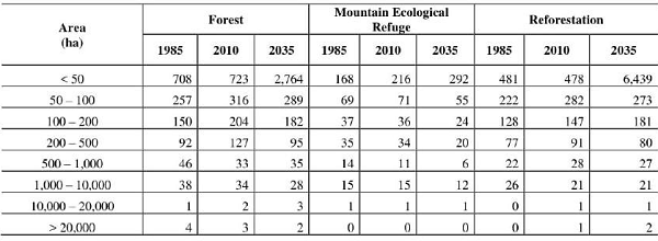 The results in Table 8 show an overall increase in the number of patches of less than 50 ha for allland cover classes over time. This indicates the fragmentation of the landscape between 1985 and 2010.As expected, in 2035 this trend will be maintained with an increase in the number of patches less than 50ha in area and a decrease in the number of patches larger than 100 ha.
