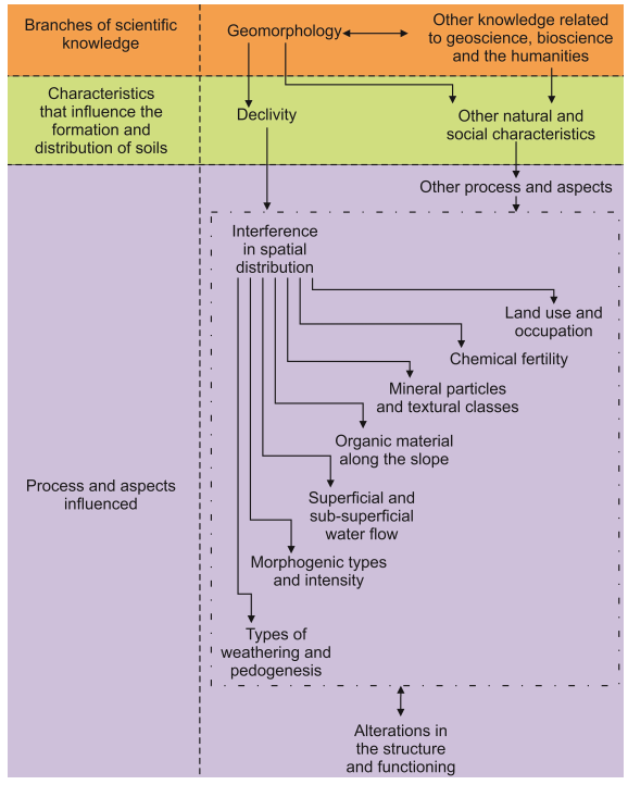 In his conceptual review, Queiroz Neto (2011) highlights the relationship between the interdependent sciences of Pedology and Geomorphology, whose importance is verified by scientific works such as thoseof Milne (1935 and 1936), Jenny (1941), Tricart (1968) and Boulet (1982a;1982b; 1982c). For Tricart (1968), this proximity is due to the alteration of the rocks, a process in which pedogenesis contributes to morphogenesis.The latter predominates on steep slopes, while pedogenesis occurs on gentle slopes with a deeper pedological cover. From this, Tricart (1968) demonstrates the interdependence between morphogenesis, pedogenesis and the actionof water flows in various ways, establishing that slope dynamics are an excellent instrument to understand the origin of soils.