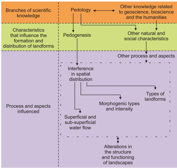 The pedological influences on the modification of landforms are also established, including the relationship of water / geochemical actions in soils modifying the slope form; the association of soil laterizationprocesses and the influences on landscape morphogenesis; and the relationship of mass movements with the creation of new forms of relief.