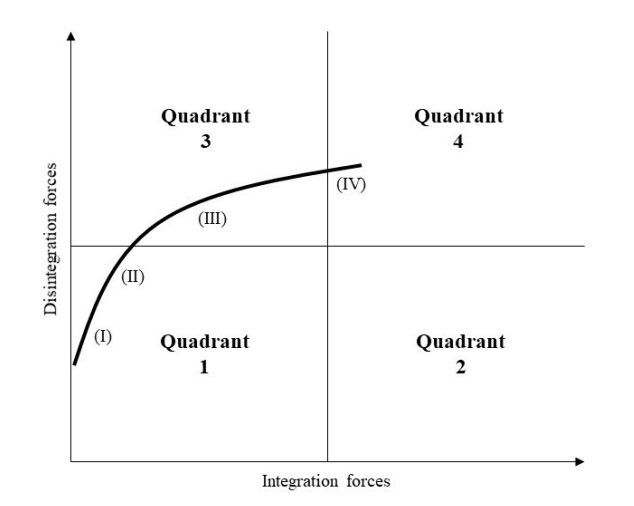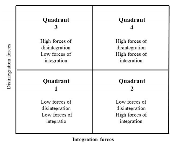 Similar to the work by Storper (1997), a distinction is made between four regional arrangements designed from the intensities with which forces of integration and disintegration manifest themselves. Thesepossibilities are outlined in Figure 1.