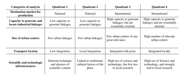 To distinguish this trajectory, a procedure was adopted that created five categories of analysis, which are associated with the economic arrangement of the region, followed by a discussion on how eachcategory fits into Quadrants 1, 2, 3 or 4. The categories are: (i) the destination market for production; (ii) the capability to generate industrial linkages and their locations; (iii) the size of urban centers; (iv) the alignmentof the transportation system; and (v) the scientific and technological infrastructure.