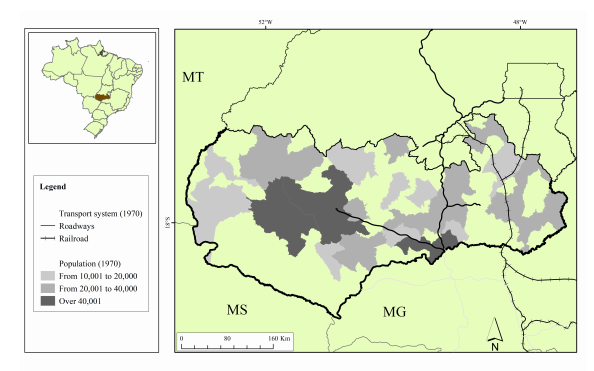 Figure 3 illustrates South Goiás in 1970, when there were still no processing industries in the region, few relevant municipalities in terms of population and the transport system connected onlya few points across the region.