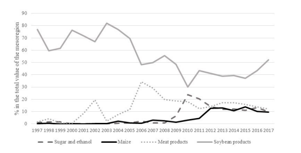 If the third moment is marked by the expansion of soybean, the fourth, after the 2000s, was defined by a greater diversificationof livestock and crop production. This process occurred in two manners: the advance of sugarcane and the growth of the corn and meat chains.