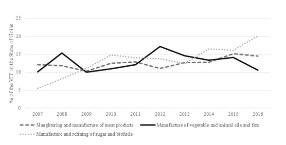 Furthermore, in Goiás there was an agroindustrial restructuring in the vegetable oils and fats sector, which lost relevance because of other productive branches. While, in 2016, this activity represented10.6% of the VIT in Goiás, the slaughtering and meat manufacturing sector registered 14.4%, and the sugar and biofuels sector became the main agroindustrial activity in Goiás, with 20.2% of the VIT. This changeis illustrated in Figure 5.