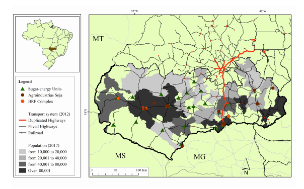 The methodology is based on a combination of quantitative and qualitative analyzes. To define the different regional arrangements, five categories of analysis were selected: the destination market forproduction; the links between agriculture and industry; urban growth; the alignment of the transportation system; and the scientific and technological infrastructure. The first three were analyzed using secondary data. Thefourth was analyzed by mapping both the highways and railways. For the fifth category, a qualitative study was conducted to identify the type of technique involved in the production system and the growth of scientific andtechnological infrastructure across the region. For the study, South Goiás was considered as the South Goiás mesoregion, defined by the Brazilian Institute of Geography and Statistics (IBGE), by the groupingof 82 municipalities.