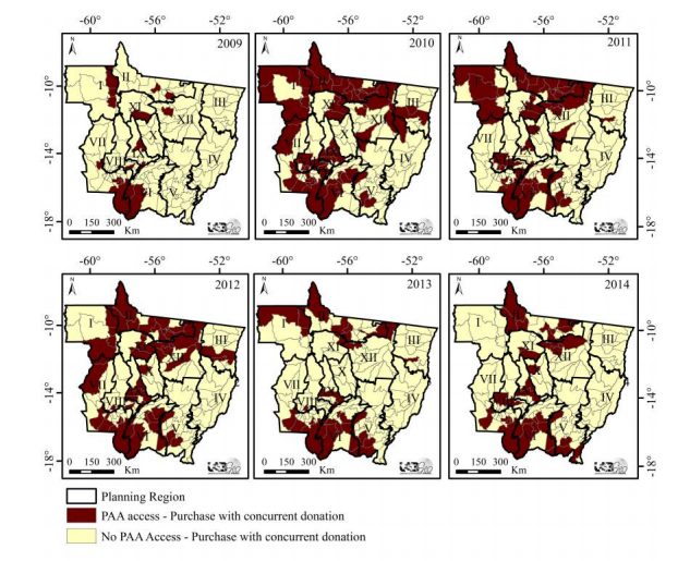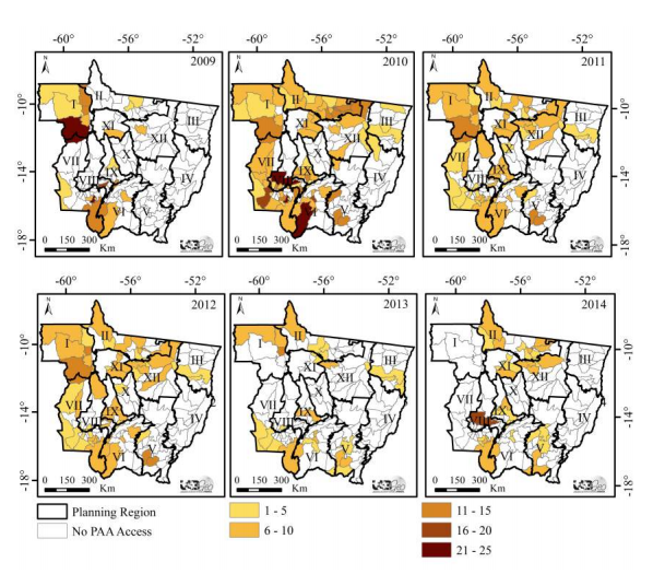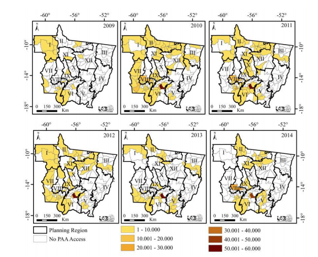 In 2009, peasants from 16 municipalities in Mato Grosso located in eight planning regions accessed the PAA-CDS through associations and/or cooperatives. In 2010, this number peaked at 56 municipalitiesin eleven planning regions. In 2011, 43 municipalities in eleven regions joined the program and in 2012 this number rose to 51 municipalities in eleven state planning regions. In 2013, 27 participating municipalities weredistributed in nine regions and finally, in 2014, 32 municipalities were spread over eight planning regions (see Figure 2). These results are similar to the findings of Scheuer, Snows, and Mendes (2014) who identified 26 municipalitiesserved by the PAA in the state of Mato Grosso in 2013.