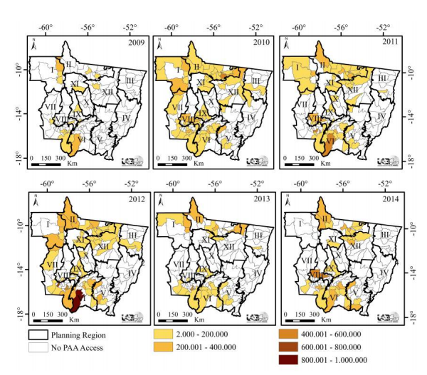 In the context of Mato Grosso, the PAA is insufficient to meet all the demand in the State, since in many planning regions there is not a single PAA project. However, in 2016, it was observed that numerouscommunity-based organizations were no longer served by the program due to the Conab's lack of financial resources, showing that diversified production for domestic supply is not a priority for governments.