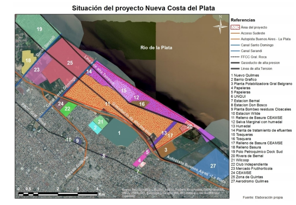 El proyecto de urbanización Nueva Costa del Plata (NCdP) fue presentado en el año 2008 por las autoridades del municipio de Avellaneda, la empresa Techint y las autoridades provinciales,siendo un emprendimiento inmobiliario de gran escala, que resulta como el producto de una iniciativa planificada en la década de 1980 por el grupo Techint mediante su subsidiaria SyUSA (Saneamiento y UrbanizaciónSociedad Anónima). La locación del proyecto abarca terrenos ubicados entre el Rio de la Plata, el canal Santo Domingo, y la Autopista Buenos Aires-La Plata, en zonas declaradas normativamente como reserva naturalen el marco de la zonificación urbana municipal de los partidos de Avellaneda y Quilmes. En estas áreas la pobreza y las necesidades básicas insatisfechas alcanzan a grandes sectores de la población.En dicho contexto el Grupo Techint pretende crear una suerte de “nuevo Puerto Madero” del Conurbano Bonaerense. El megaproyecto inmobiliario pretende urbanizar el frente costero en esta zona, el cual abarcaríaunas 102 hectáreas en el partido de Avellaneda y unas 128 hectáreas en el partido de Quilmes, con una inversión inicial de 100 millones de dólares. Donde está proyectado instalar hoteles,restaurantes, comercios, torres residenciales de alto estándar y una sede de la Universidad de Avellaneda (Aizcorbe, et al, 2013). Para ello se utilizarían en parte tierras del relleno sanitario Villa Dominicodesactivadas y otra parte tierras de la reserva natural contigua.