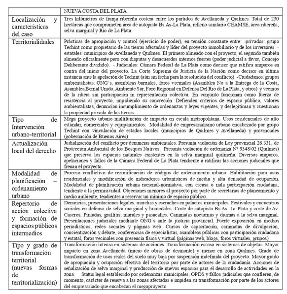 La construcción del proyecto implicaría una fuerte transformación territorial y eso generó un amplio conflicto de intereses con distintos actores sociales. Este proceso conflictivocumple una década de iniciado, y ha supuesto hasta el momento una transformación en las territorialidades presentes en el área de estudio. Hasta el momento, la acción colectiva ha logrado frenarel proyecto de urbanización en favor de una postura conservacionista. La coalición público privada conformada para llevar adelante NCdP se ha visto limitada en función de la judicializacióndel caso. Los aspectos normativos modificados no han sido suficientes para concretar la iniciativa; y la ocupación material y simbólica de las organizaciones sociales en la zona ribereña en ambos partidosha supuesto la conformación de nuevos esquemas de poder en estos espacios de reserva. A continuación, se presenta la tabla N° 1, que sintetiza los aspectos más salientes del análisis realizado.
