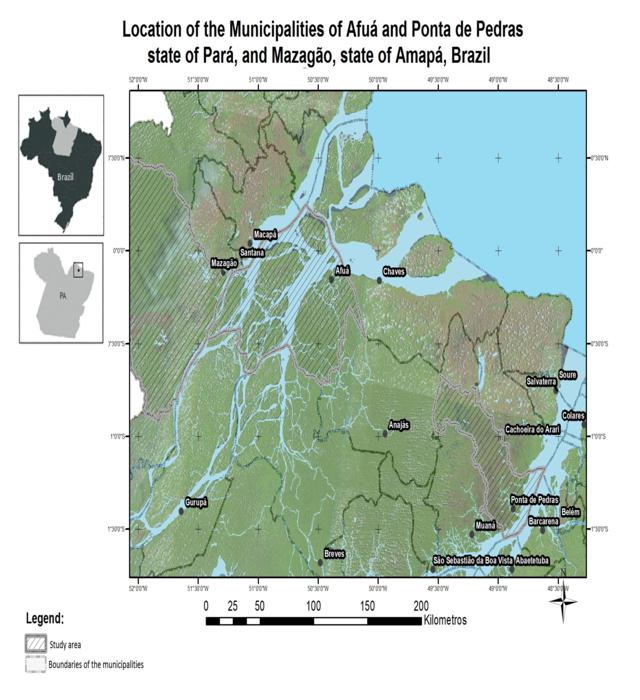 The municipality of Ponta de Pedras is located on Marajó Island and, according to the 2010Census data (IBGE, 2017), it had 25,999 inhabitants in 2010. The inhabitants of the urban areacorresponded to 48% of the total inhabitants. The Municipality of Afuá is located in Marajó Bay, on thenorthern channel of the mouth of the Amazon River.