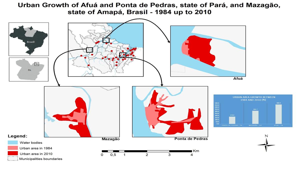 Between 1984 and 2010, the urban areas of these cities grew significantly. Mazagão’s area grewjust over 300%, Afuá, grew more than 450%, and Ponta de Pedras’ area increased 180% over thisperiod, Figure 3 shows the difference in the growth intensity for the three cities, based on the mapsalone.