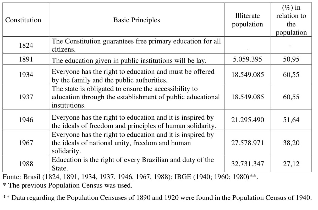 In different periods of Brazilian history, as shown in Table 1, education was treated as one basicright of citizens. However, it is important to advise, when considering constitutional provisions, that thecitizenship status has not always been destinated, by the letter of the law, to every inhabitant of thecountry.