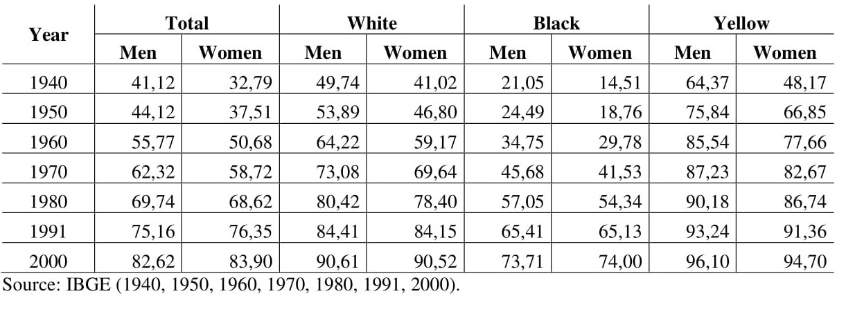 Until the 1980s, women represented the major proportion among the illiterate. Considering thecolor or race variable, it is possible to perceive that in every population census the black populationachieved the lowest literacy rates. Ferraro and Kreidlow (2004) noted how educational policiescontributed to the increase of social inequality in Brazil, reverberating in the rise of “prejudice anddiscrimination” (p. 180).