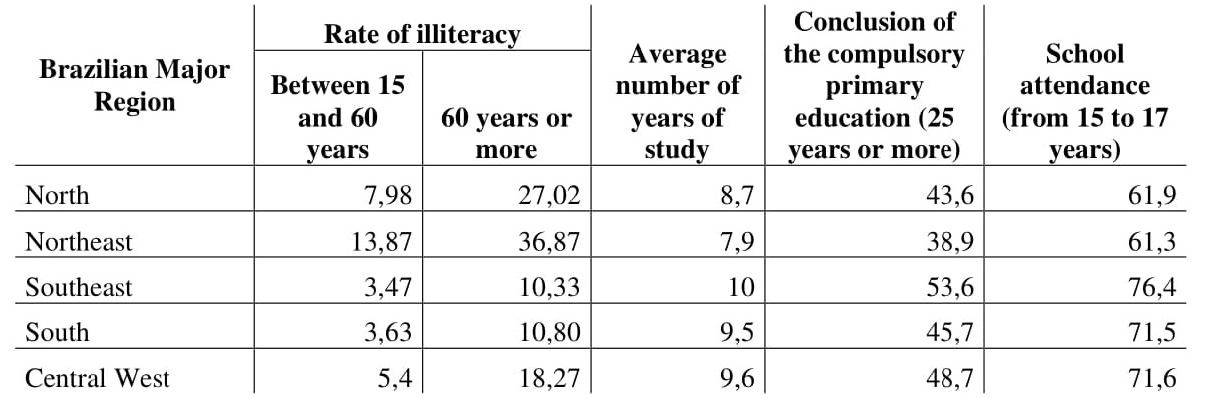 Access and attendance to educational establishments occur disparately in the Brazilian territory.The northeastern population, for example, studies an average of 2.1 years less than the one from thesoutheast. Regarding to the illiteracy rate, the lowest incidence occurs in the population group between15 and 60 years of age, being 3.01 times lower when compared to the population over 60 years of age.Both cases have in common the regionalization of the educational vulnerability. The Southeast regionpresented the best indicators, 3.47% and 10.33% respectively. In contrast, North (7.98% and 27.02%)and Northeast (13.87% and 36.87%) regions had the worst results. In short, considering the average ofthe population groups, in the Northeast the illiteracy rate is 3.68 times greater than in the Southeast,while in the North it corresponds to 2.54 (IBGE,2018).