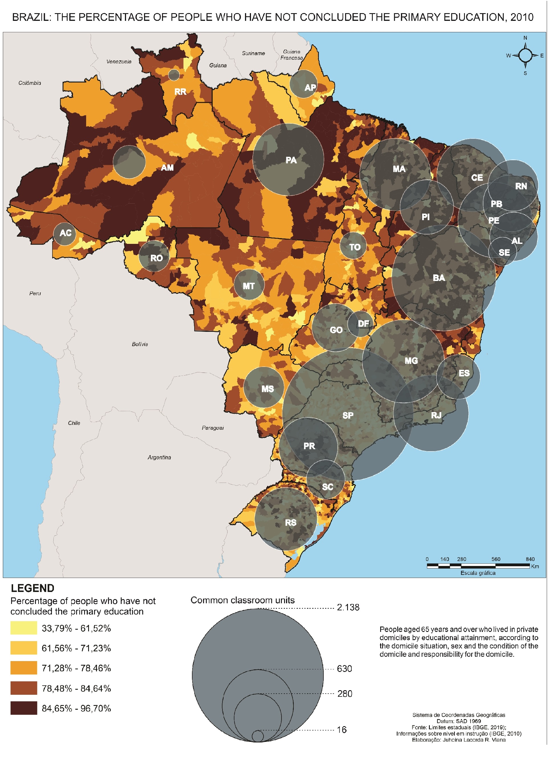 Figure 1 presents the result of basic education non-completion in Brazilian municipalities and thenumber of common classrooms related to EJA in states. In 197 municipalities, more than 90% of thepopulation haven’t completed the basic education. It can be noted that most of them are located in theNorth and Northeast regions, with the exception of 30. Notably, Chaves/PA, Casserengue/PB and MonteAlegre dos Campos/RS can be highlighted, since they presented rates of 96.71%, 94.90% and 94.72%, respectively. These municipalities have in common high rate of rural population, Monte Alegre dosCampos/RS and Chaves/PA had 79.21% and 88.05% respectively (IBGE, 2020). The regionality ofeducational inequalities can also be observed in other education levels. On average, the population thatlives in the Southeast has 1.94 times more opportunities of access to college education than theNortheastern and 1.80 times more than the inhabitants of the North region (IBGE, 2010).