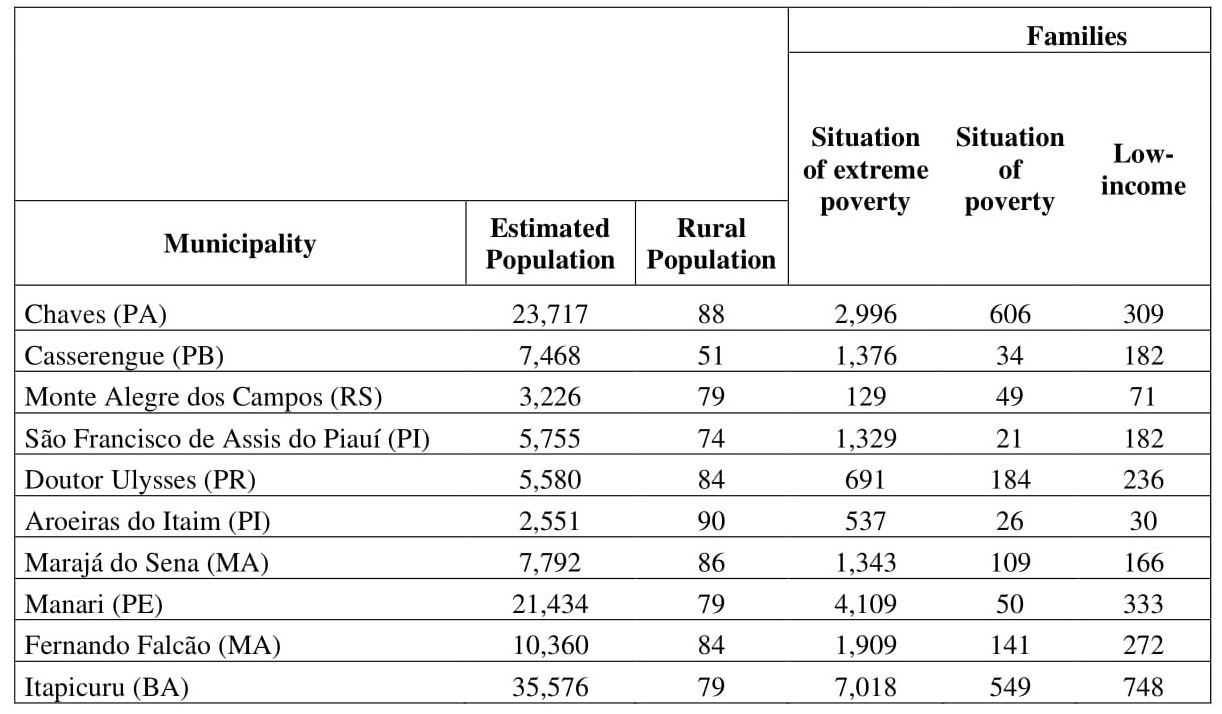 It can be observed that the selected municipalities share some demographic and socialcharacteristics. The first one consists in the prevalence of municipalities with low demographic patterns,70% of them have less than 10,361 inhabitants (IBGE, 2019). The second refers to the prevalence ofrural above the urban population in all cases. Except for Casserengue/PB, all the other municipalitieshave an equal or greater percentage of 74% inhabitants in the field (IBGE, 2010). Finally, therepresentation of social vulnerability in these municipalities is evident.