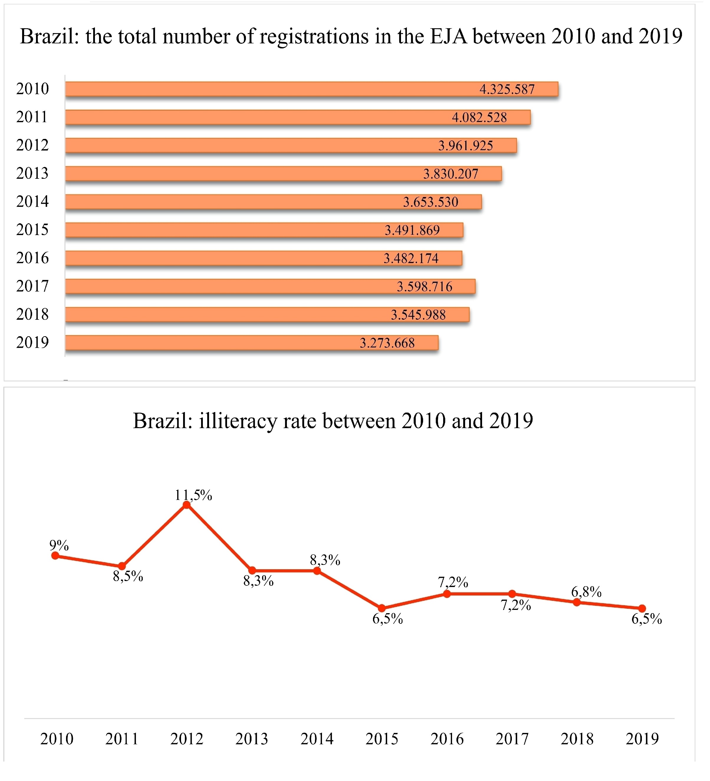 EJA from 2010 to 2019. During this period, the illiteracy rate fell from 9% to 6.8%. There is also a24.22% decrease in the number of registrations made at EJA.