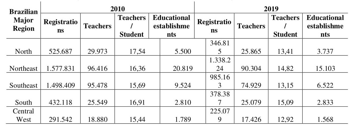 2)The importance of EJA in the Northeast region, in which the reduction of the register ofregistrations was proportionally lower than the loss of educational establishments and teachers;