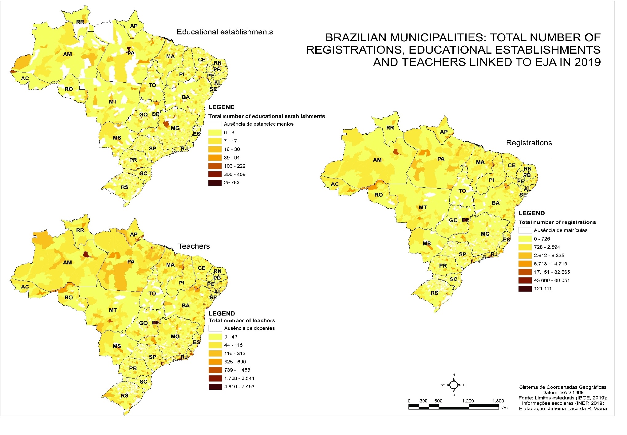.The verticalization of the analysis in the municipalities indicates the heterogeneity of theinformation when considering the intraregional scale. Figure 3 shows the spatial arrangement ofregistrations, teachers and educational establishments related to EJA in Brazilian municipalities.