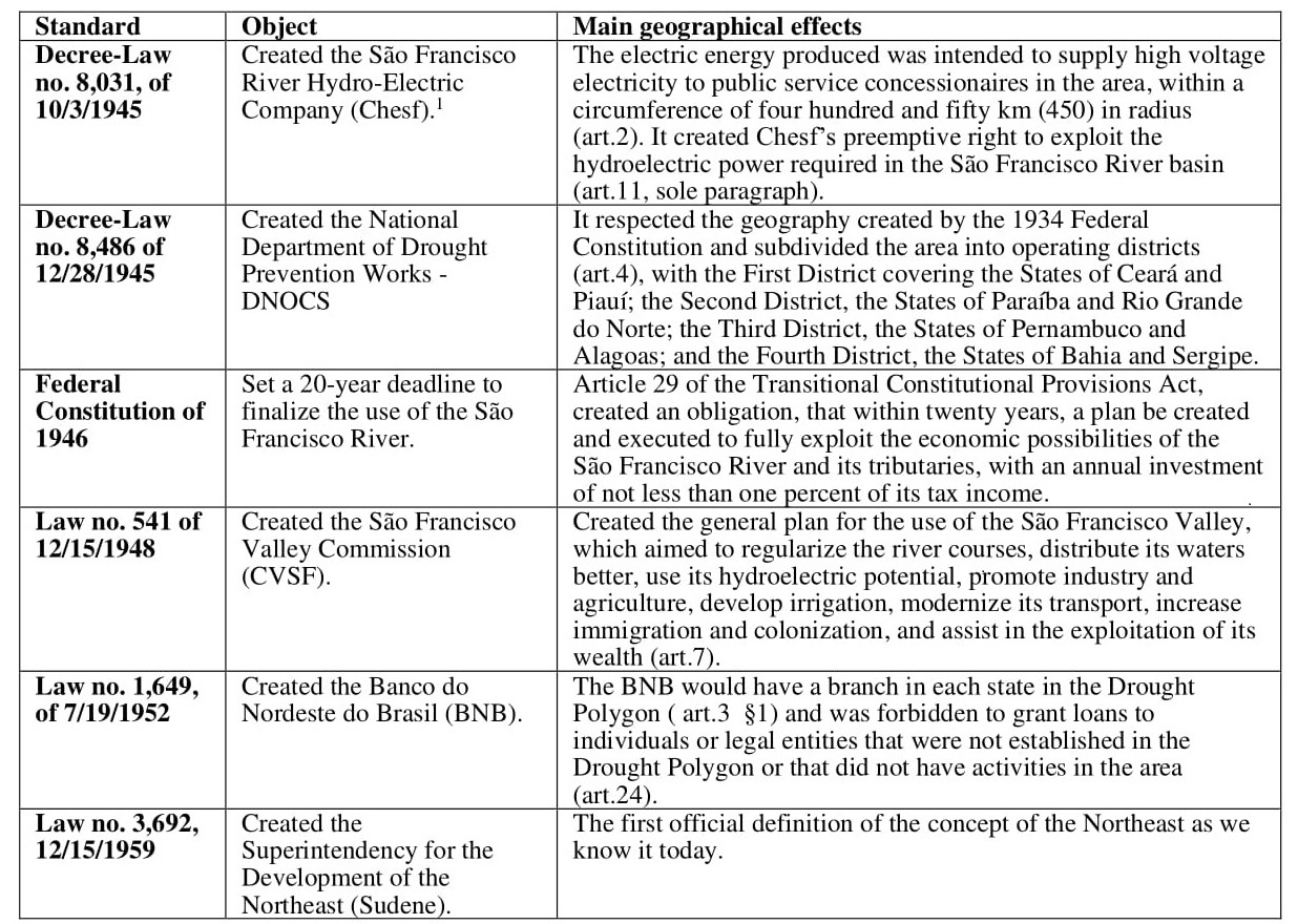 Despite the legislation referring to the area as the “North”, it can be said that the polygonal area,which would become known as the “Drought Polygon”, represents a legal recognition that the areadeserved to be treated homogeneously and distinctly from the areas outside the polygon. If previouslythe “North” region’s movement was centrally located in the state capitals and obeyed the federativelogic, from this point there was a basis for a delimited regional development that did not coincide withthe area of the states. The concept of state territory was replaced by a regional one, thus requiringimprovements in map production and how the economic engine of this regionality would be identified.that, ultimately, would shape the morphology of what would come to be called the Brazilian Northeastas a geo-economic region.