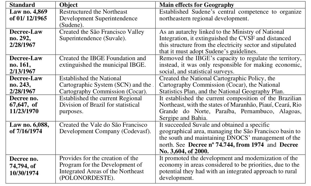 At an official level, under the aegis of the IBGE, the regionalization of the country was taking itsfirst steps, however, new economic agents also promoted important transformations that should berevisited, to merge the IBGE’s eminently geographical vision with the regional administrativeframeworks that were created to provide territorial cohesion to the region called Northeast by Geography. In the week before his removal from the government in 1945, and the resulting end of the Estado Novo, Vargas issued decree-laws20, outlining the normative embryo of regional development in Brazil, which would continue until the 1964 Military Regime.