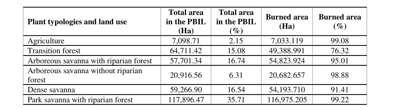 Except for transition forests, all the plant typologies had more than 90% of their areas burned; insome cases, the fires affected the whole area covered by a plant typology (Table 1).