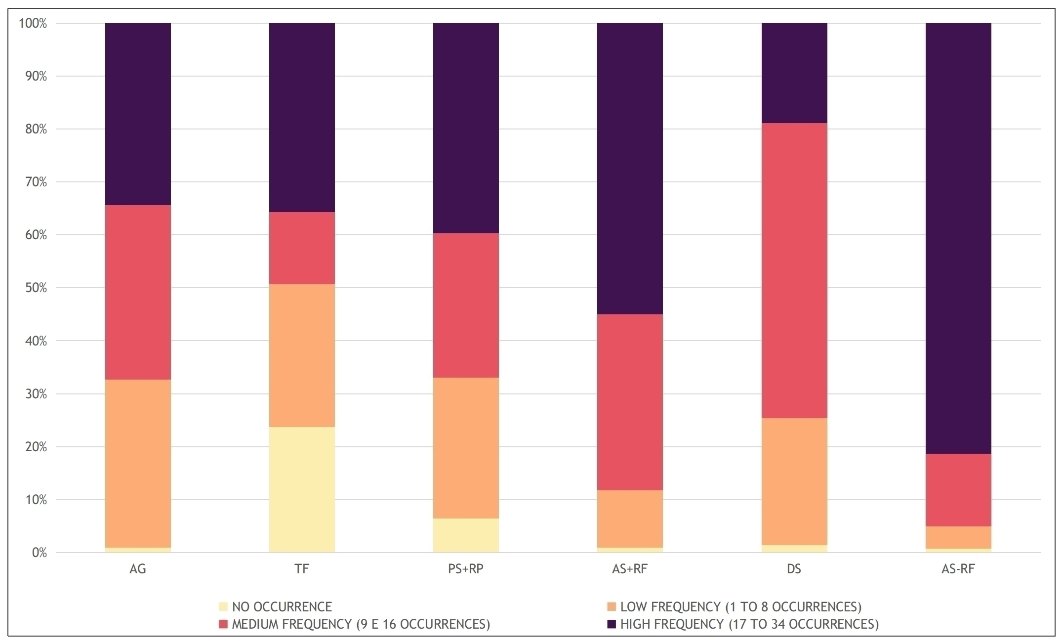 The results of the overlay were used to organize the data; each plant typology and soil use class was divided into three classes, considering the mean interval between the fire frequency in the study period, according to the area occupied in the PBIL. The classes established were: no occurrence, low frequency (1 to 8 incidences of burning), medium frequency (9 to 16), and high frequency (17 to 34).