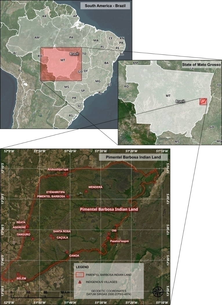 The Pimentel Barbosa Indigenous Land (PBIL) has a population of 1,743 Indigenous people (IBGE, 2010) distributed over 13 villages (Figure 1). It was legally recognized on August 20, 1986, bydecree n°. 93,147 (ISA, 2019) and is located by the Rio das Mortes River, within the Xingu River Basin,in the municip alities of Canarana and Ribeirão Cascalheira, state of Mato Grosso, Brazil. The reserve has an area of 328,966 hectares (FUNAI, 2019).