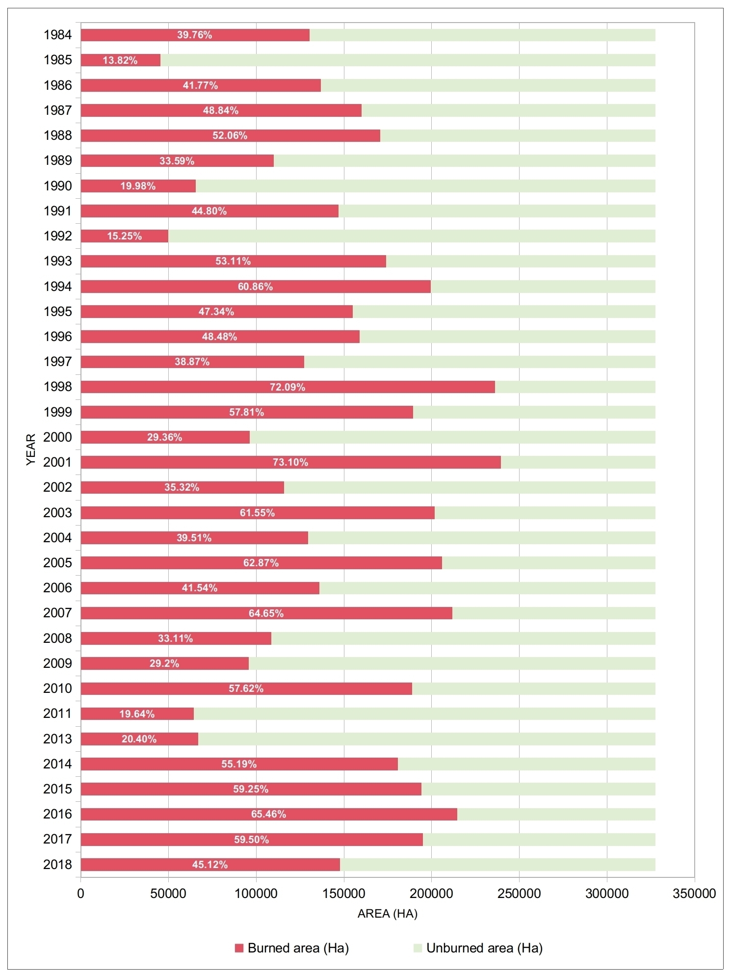 Large fires, covering above 50% of the total PBIL area, occurred in fourteen of the years in question. In addition, there was a high variability in the extension of the annual fires. The highest incidence was in 2001 (39,463.6 ha (72.79%), followed by 1998 (236,155.38 ha, 71.79%), 2016(214,447.28 ha, 65.19%), 2007 (211,771.7265 ha, 64.37%), 2005 (205,955.19 ha, 62.61%), 2003(201,646.59 ha, 61.30%), and 1994 (199,371.58 ha, 60.61%). The lowest number of burned areas wereidentified in 1985 (45,262.42 ha, 13.76%), 1990 (65,442.49 ha, 19.89%), and 1992 (49,963.98 ha,15.19%) (Figure 3).
