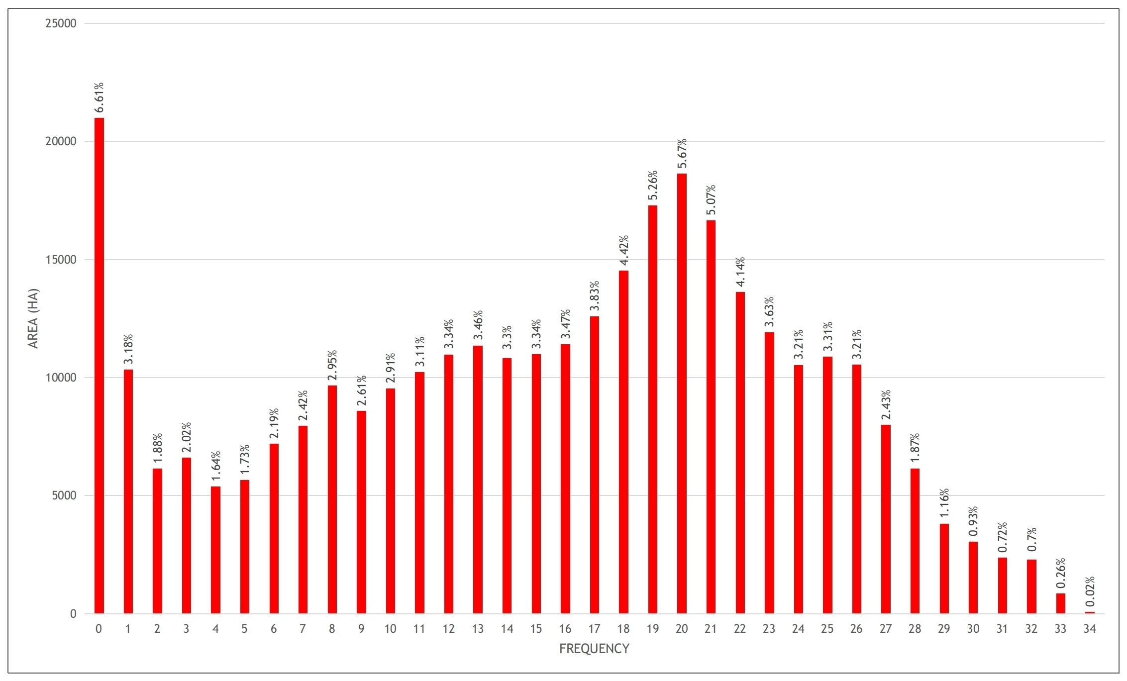 The frequency of the fires was distributed between zero and 34 repetitions (Figures 7 and 8). The areas with the highest rates of burning had an incidence of 20 events within the 34-year study period, totaling an area of approximately 18,660,559 ha. Only 21,757,807 ha (6.61%) of the PBIL’s area had nofires, and 10,470,690 ha (3.18%) had only one fire during the period evaluated.