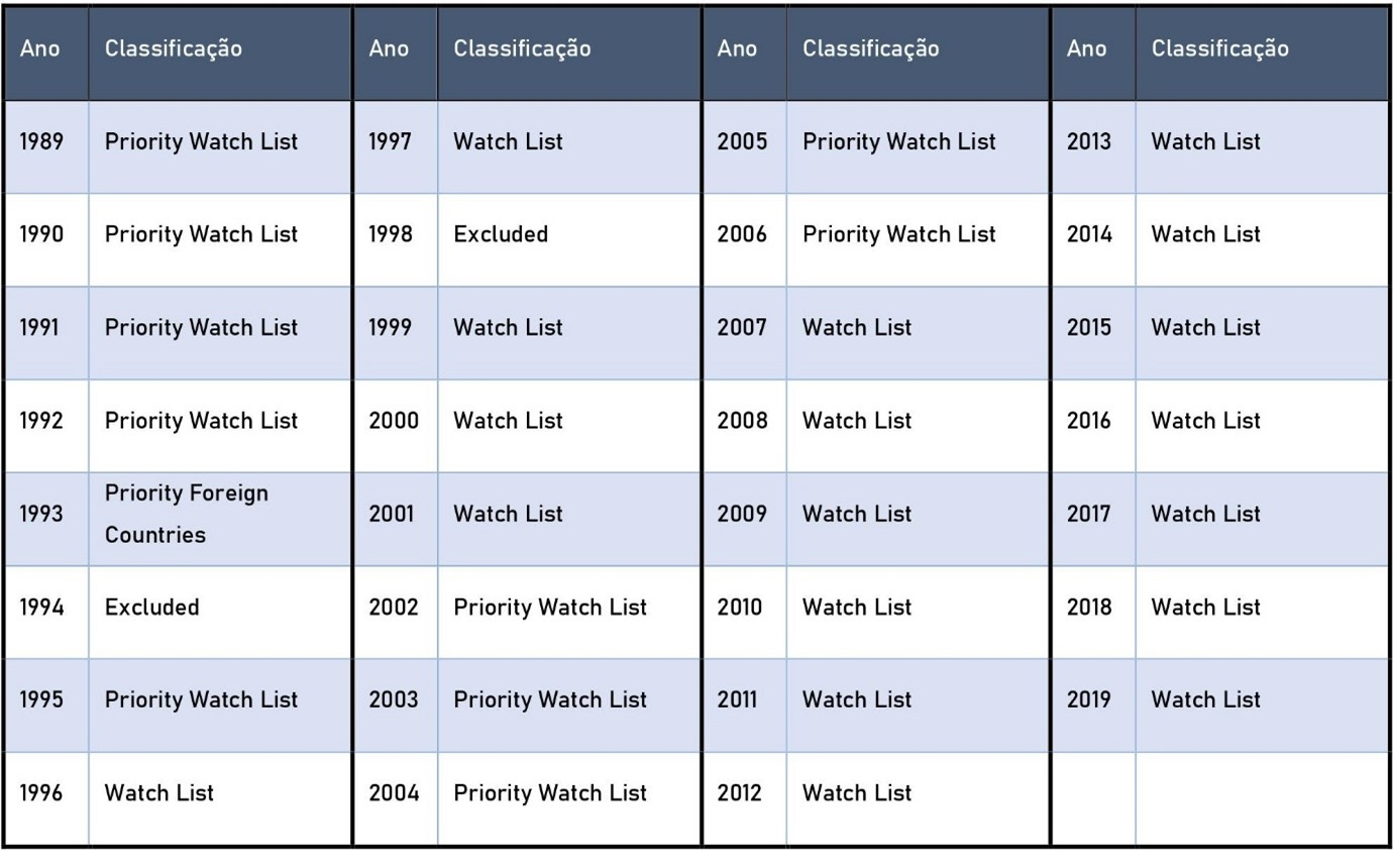 In the 1989-2019 Reports (Table 1), Brazil fluctuated between demotion and promotion in an Intellectual Property ranking that acts as a prize or a punishment to the country in question. The country has been on the Watch List since 2007, but in 1993 it was classified as a Priority Foreign Country, the most serious category and the USTR (1993, p. 04) announced the beginning of an investigation into Brazilian practices. Over the following years, there were ruptures in the traditional Brazilian Intellectual Property laws and a consequent improvement in the country’s assessment in the respective Reports. In 1994, Brazil signed the TRIPS (Agreement on Trade-Related Aspects of Intellectual Property Rights).The country approved the Intellectual Property Law (Law No. 9,279), and the new Copyright Law (Law No. 9,610), in 1996 and 1998, respectively.