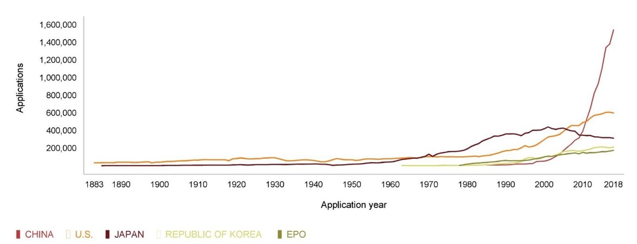 From 1968 to 2005, the Japanese office had the highest number of applications, when it was surpassed by the American body, which has gained importance since then; the European and South Korean institutes have grown since 1975. Asia has become the most active patenting region and Chinahas led ranking since 2011 (also in the brands and design categories), accounting for 47% of the total applications in 2018. Americans lead patent applications beyond their national borders, followed byJapan, Germany, South Korea, and China. Therefore, these five countries are foremost in innovation developments requiring protection abroad, which indicates the commercial expansion policies aimed atmarkets in other territories.