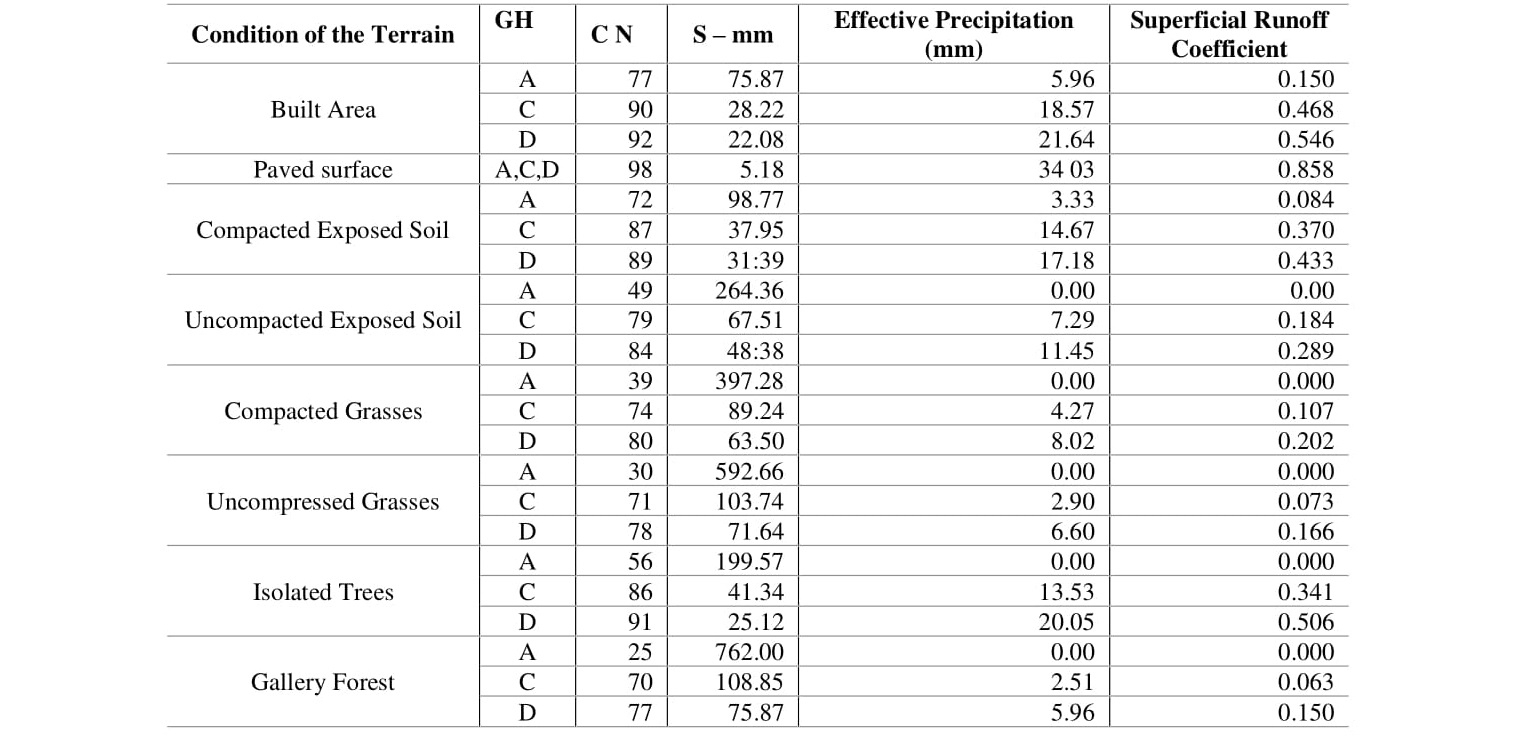 Therefore, the CN values were determined based on the assessment of hydrological groups (GH),resulting from the assessment of soil types, in particular, texture and depth, the coverage and use conditions, and the antecedent humidity. In this method, the CN values range from 0 (low flow capacity) to 100 (high flow capacity). It is noteworthy that the calculation also considered intermediate humiditysoil conditions, with the accumulated precipitation varying between 13 and 53 mm in the previous fivedays.