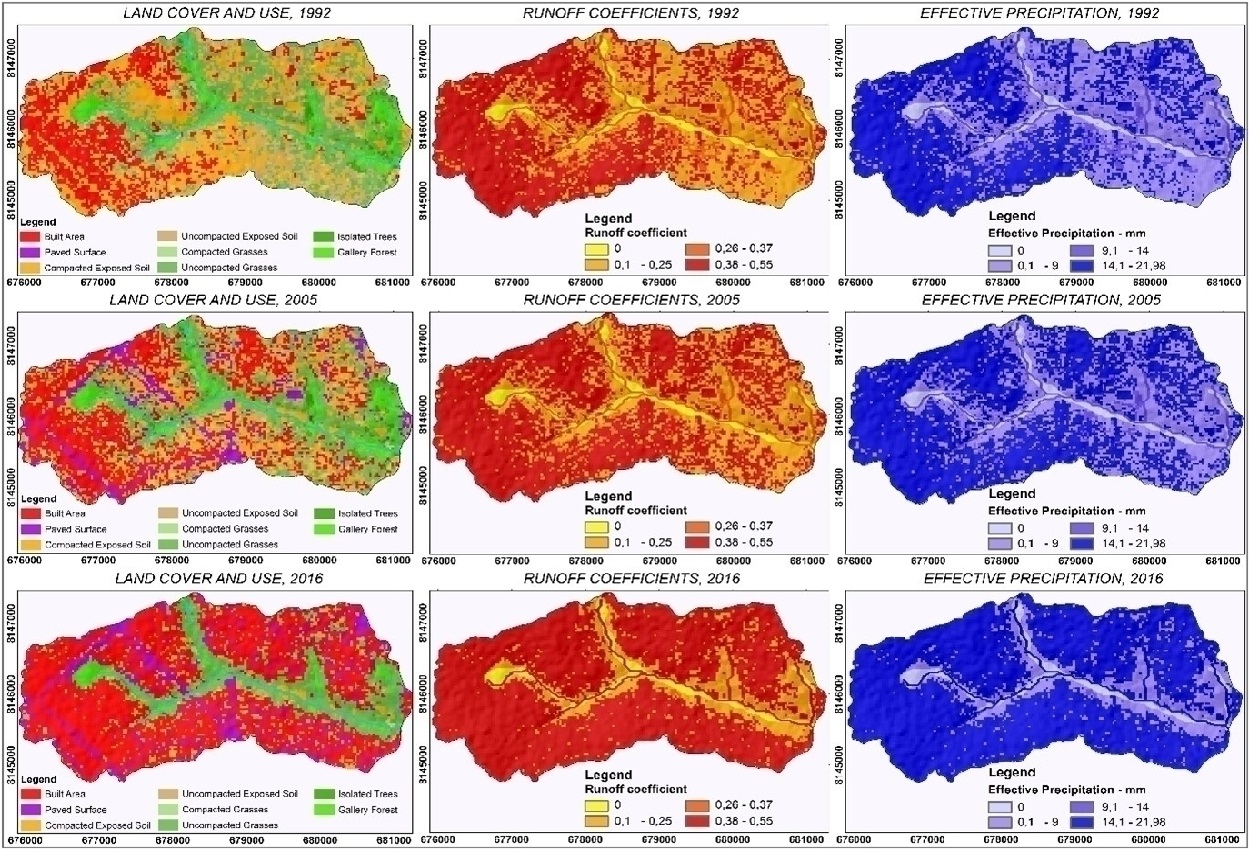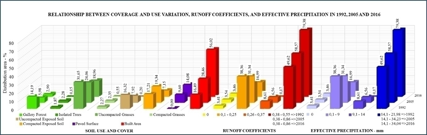 Considering the effects of expansion and urban density due to rainfall, the general trend was are duction in areas with low flow coefficients and a consequent increase in those with values above 0.37.This is a direct reflection of the growth in built-up areas and, mainly, the emergence of paved surfacesthat raised the extreme coefficient value, from 0.55 in 1992, to 0.86 in 2005. Taking into account thes cenarios of rainfall events for 1992, 2005, and 2016, the general trend was to reduce areas with runoff coefficients of 0.1 to 0.25 and increase those with runoff coefficients of 0.38 to 0.86, as well as thoseareas with high effective precipitation.