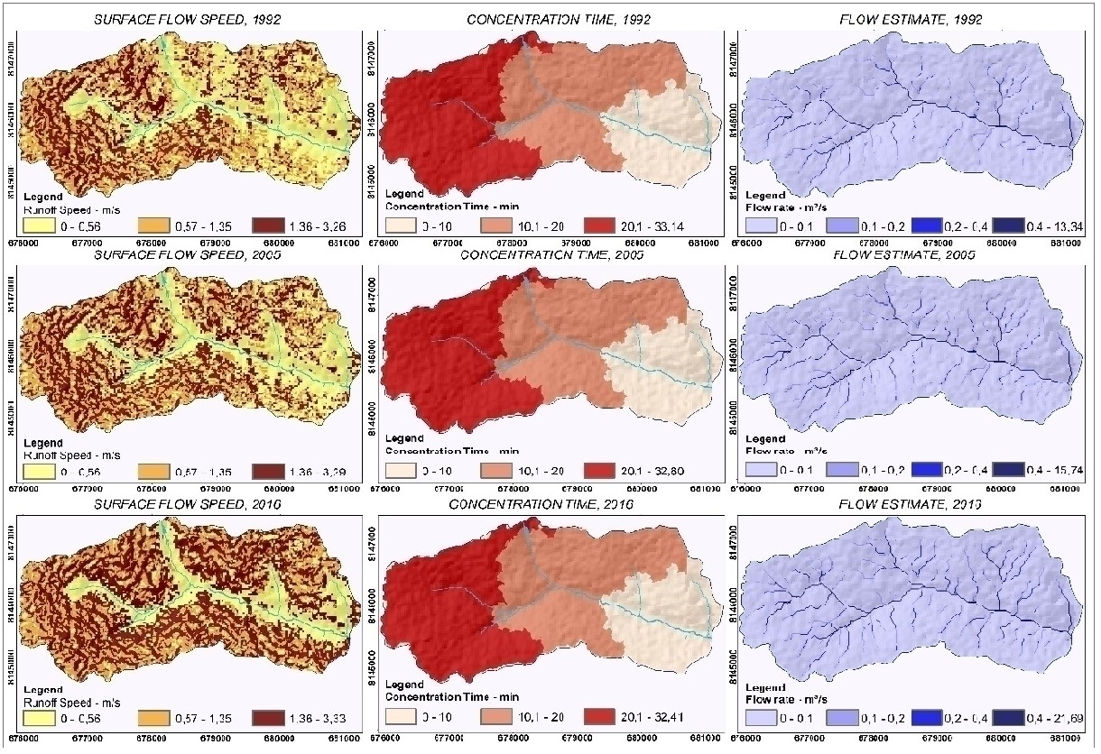 Under the conditions of land coverage and use in 1992, 33.14 minutes were required for the entirebasin to contribute to the flow at the mouth. With the advance and densification of urbanization, the time for this process was reduced to 32.8 minutes in 2005 and 32.41 minutes in 2016. Considering the growthin areas with high effective precipitation, the increase in speeds, and the consequent reduction in the time of concentration of run off, the main result has been the considerable rise in flow estimates duringrain events throughout the period considered. Thus, given the conditions of land coverage and use in 1992, because of the intensity and duration of extreme rainfall events, the maximum flow estimates were13.34 m³/s at the river mouth. Under the conditions in force in 2005, the estimates rose to 15.74 m³/s.The estimates continued to rise over the next 11 years, reaching 21.69 m³/s, as systematized in Figure 4.