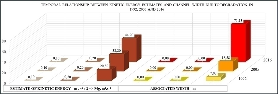 As shown in Figure 6, the maximum energy estimate resulting from the volume of the runoffspeed rose from 20.8 Mg.m².s-² in 1992, to 32.2 Mg.m².s-² in 2005 and then 44.2 Mg.m².s-² in 2016.Similarly, the main channel had an average width of 7.08m in 1992, 18.58m in 2005, and 71.13m in2016. From the relationship between the two quantities, it can be seen that for estimates of up to 0.2 Mg.m².s-², there was no evidence of associated erosive processes throughout the study period. However,for estimates above 0.2 Mg.m².s-², especially for the years 2005 and 2016, the relationship between the increase in the flow energy estimate and the average channel width is apparent, since 2005 it has alwaysbeen over 18 m.