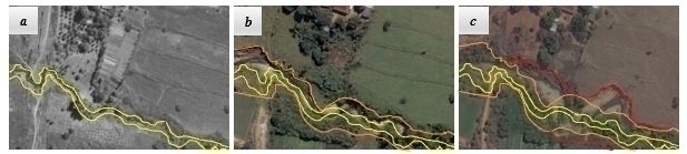 The land cover and use maps were elaborated using the sequential and logical evaluation of aerial photographs from 1992 in shades of gray and a spatial resolution of 33 cm, and colored images from the QUICKBIRD and GEOEYE satellites, from 2005 and 2016 respectively, with 50 cm spatial resolution.Supervised classification was adopted by grouping adjacent pixels and those with similar spectral characteristics, spectral detail of 18 and spatial detail of 8, both on a scale from 1 to 20, and a minimumsegment or grouping of 4 pixels. The field validations took place through visits to representative sites ofeach class and in areas that had remained unchanged throughout the period. The erosive processes were mapped through visual inspection, based on the same images. The use of extremely high spatialresolution images is especially efficient in determining classes with different coverage and useconditions and, consequently, has a better detailing of the water proofing levels, as verified by Lechiu etal. (2012).