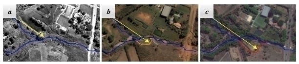 The process of channel degradation by erosive processes indicates that the highest rates of degradation have segments with different natural conditions in the face of anthropic changes. Thus, inpart a of Figure 8, it is clear that in 1992 the channel was remarkably sinuous in the middle of the plain.However, given the tendency of the flow to increase in peak situations this morphology is not conduciveto the flow of large volumes of water in increasingly shorter intervals, which necessarily leads the channel to adapt to the new conditions. This adaptation undergoes an erosive process of the concavemargins and the subsequent partial deposition of the material on the convex banks. Therefore, besides becoming wider, it starts to acquire a more rectilinear character, allowing larger and larger volumes toflow in shorter intervals of time. Consequently, the segment observed in 1992 had deteriorated by 2005,as can be seen in part b of the same figure. In 2016, the same segment was already very degraded, with anotable involvement of part of the land adjacent to the channel.