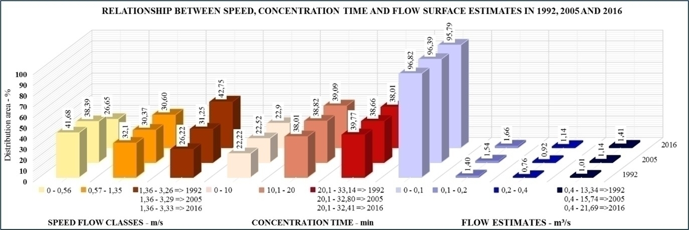The rise in soil waterproofing has impacted directly on hydrological dynamics. Specifically, the increases in effective precipitation, speed, and consequently reduced concentration times, as well as agrowth in run off volumes, lead to an intensity apparent in environments with a greater flowconvergence, such as headlands and drainage channels. As can be seen in Figure 4, in 1992, in most ofthe basin (41.68%), speeds of up to 0.56 m/s predominated, with the maximum reaching 3.26 m/s. Since2005, the classes above 0.56 m/s have been prominent, with estimates that 31.25% of the basin hasspeeds of 1.36 m/s and 3.29 m/s. For 2016, the estimates of flow velocity above 1.36 m/s covered about42.75% of the basin and could reach up to 3.33 m/s. A direct consequence of this increase, including the area covered by the highest velocity classes, has been the reduction of the concentration time and theensuing rise in the intensity or flow of the surface runoff.