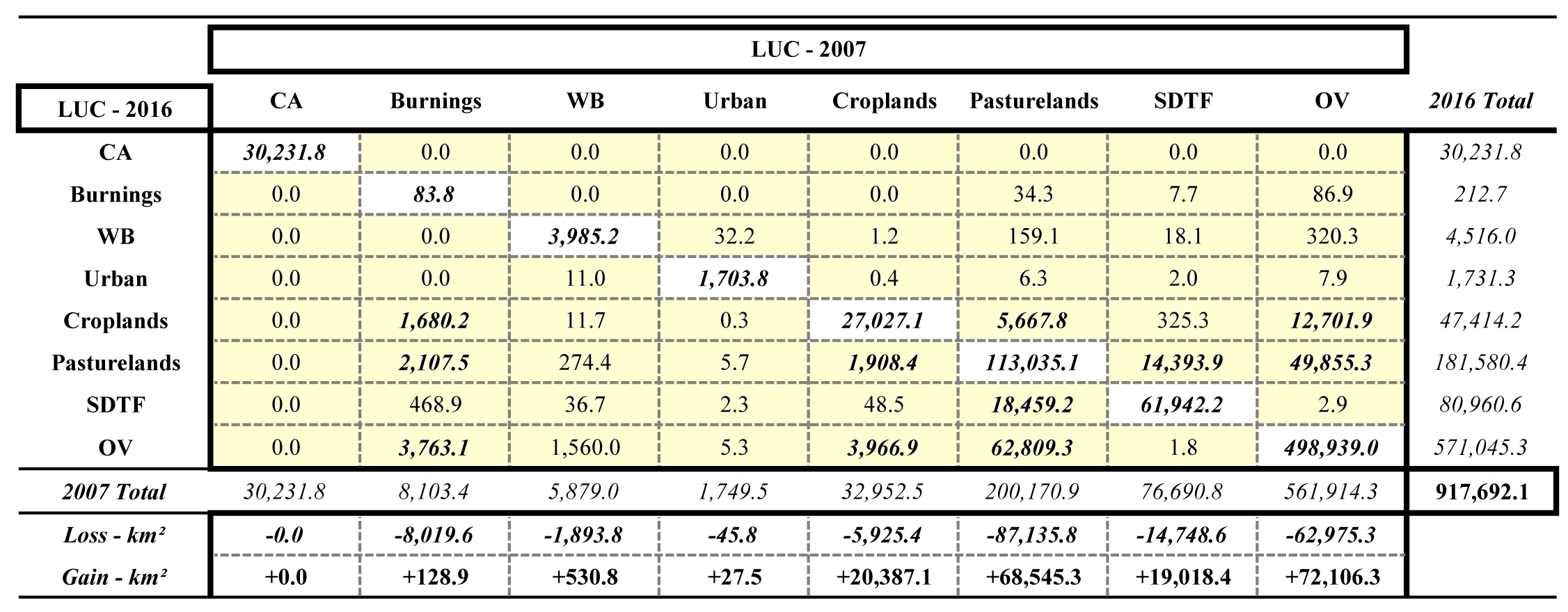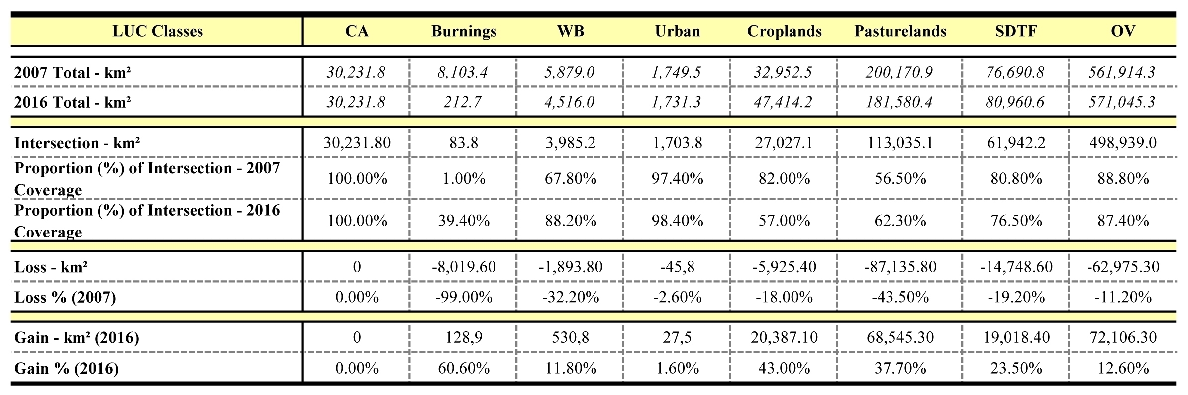 Table 5 (conversion matrix) below enables the assessment of the change dynamics of the LUC classes. For evaluation purposes, the matrix of the 2007 LUCs with its conversion to 2016 is shown inthe matrix columns. The lines, in turn, show the 2016 LUCs distribution compared to the classes they belonged to in 2007. The diagonals resulting from this structure show the common areas between thetwo mappings, that is, unchanged areas. As a result, any value outside the diagonals represents converted areas, thus gains (rows) or losses (columns). Given the purpose of this research, theevaluations focus particularly on the areas of Other Vegetation and, more importantly, on the Seasonally Dry Tropical Forests.