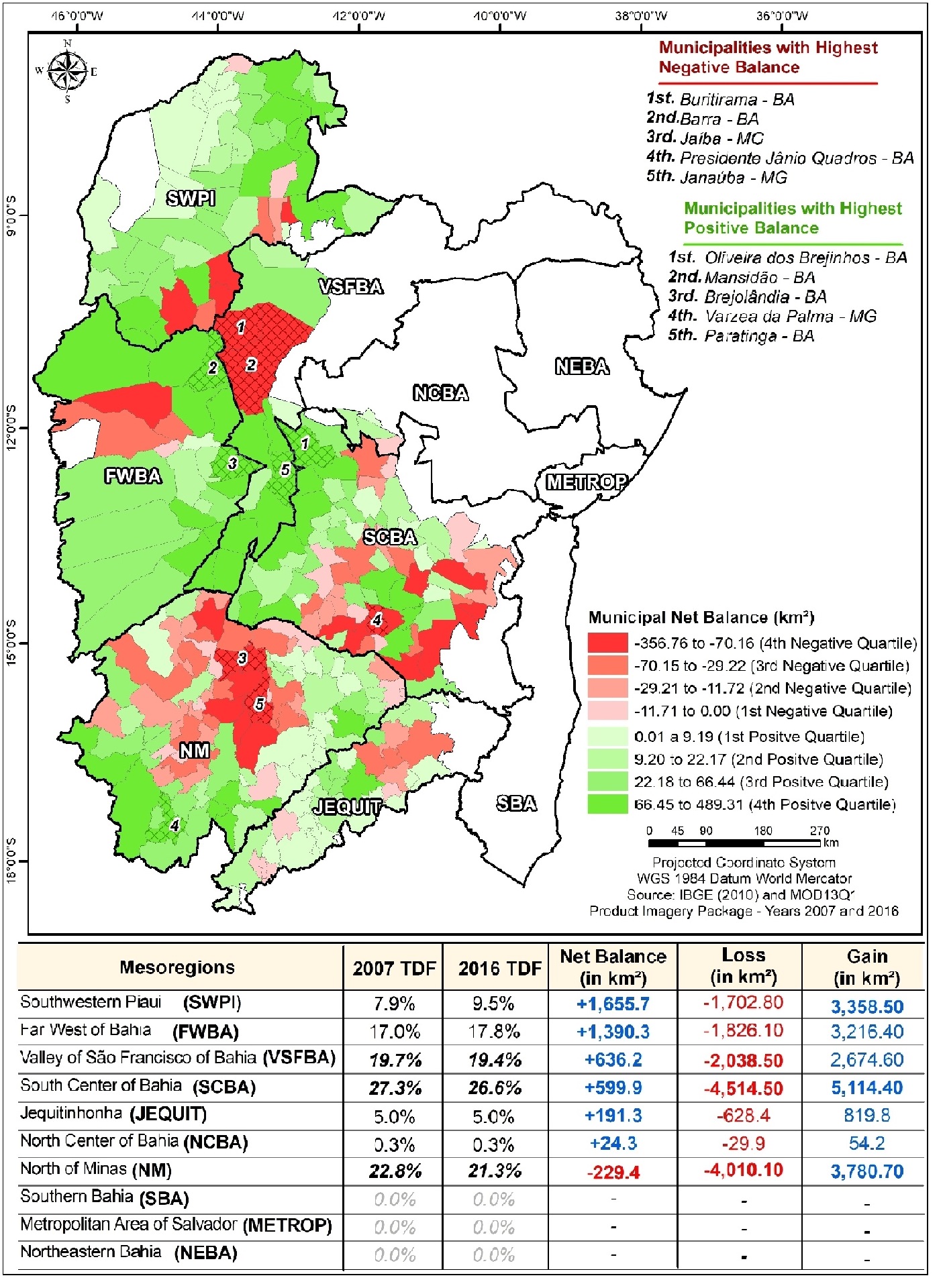 Figure 6 shows the spatial distribution of the net balance (loss/gain) for each municipality in the study area, and it is notable that in the mappings, SDTF areas were identified in 294 of the total 619 municipalities. Of these, 98 and 196 municipalities registered negative and positive net balances, in 2007 and 2016, respectively, once again demonstrating the prevalence of gains over losses. It is important to highlight, however, that despite the dominance of the gains, the positive net balance wasnot verified in the seven mesoregions with identified SDTFs. Of the mesoregions listed, the North ofMinas mesoregion (MG) registered the only negative balance.