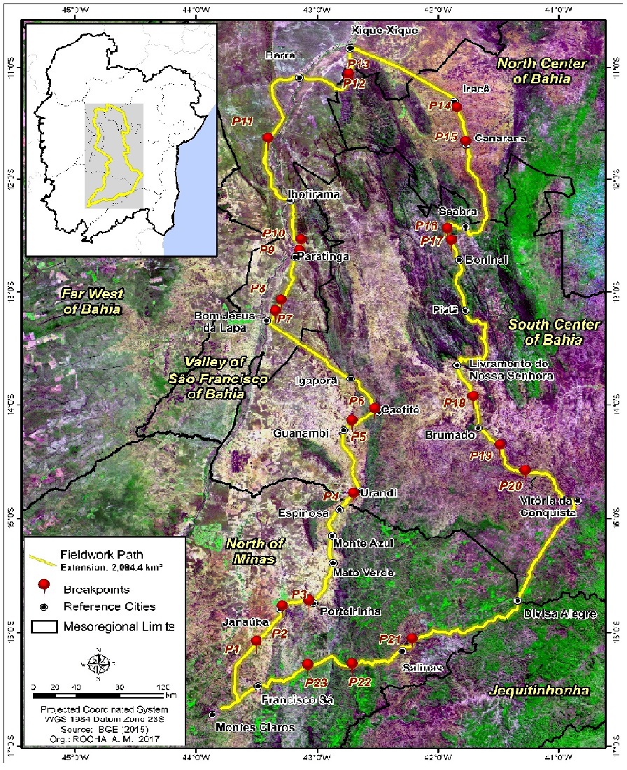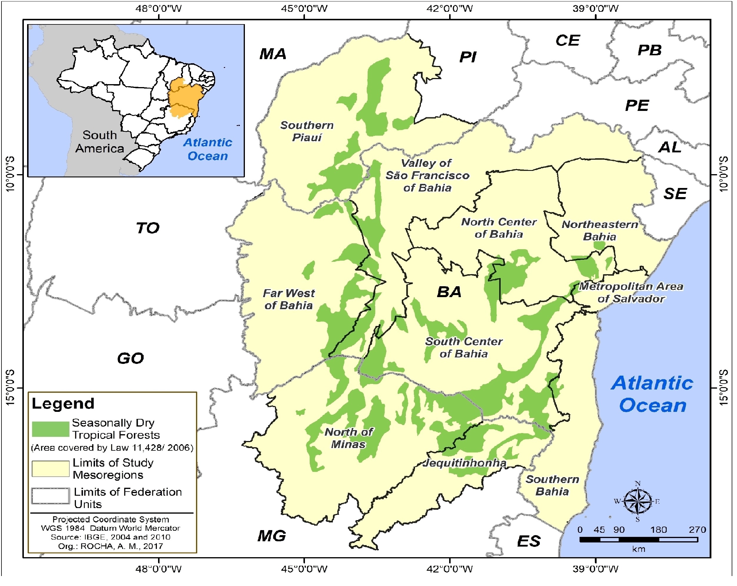 Given the above, this section clarifies the fundamental methodological aspects related to there search. Figure 1 shows the limits of the areas considered in this work. The study area consists primarily of the semi-continuous stretch of Seasonally Dry Tropical Forest, with a North-Southorientation, covered by the Law Enforcement Area 11,428 of 2006 (BRASIL, 2006). As the cartographicproducts used to delimit the vegetation formations of the Atlantic Forest are on a scale of 1: 5,000,000 and thus imbricated with generalizations, the mesoregional geographical unit was the spatial criterionused as a parameter to delimit the Study Area (SA) as from this perspective, any SDTF area not coveredby the IBGE mapping scale could be identified by the mapping conducted in this research.