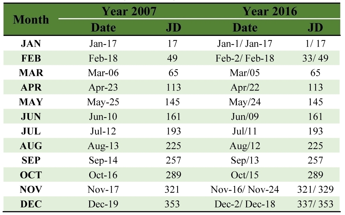 Once the image package had been defined, images were obtained referring to four tiles on the MODIS grid to cover the entire study area: namely, H13V09, H13V10, H14V09, and H14V10. These images were acquired free of charge from the United States Geological Survey - USGS for January to December of 2007 and 2016. The images are listed in Table 1. By obtaining products for each month of the year the intention was to understand the dynamics of the spectral behavior of the targets in the study area.