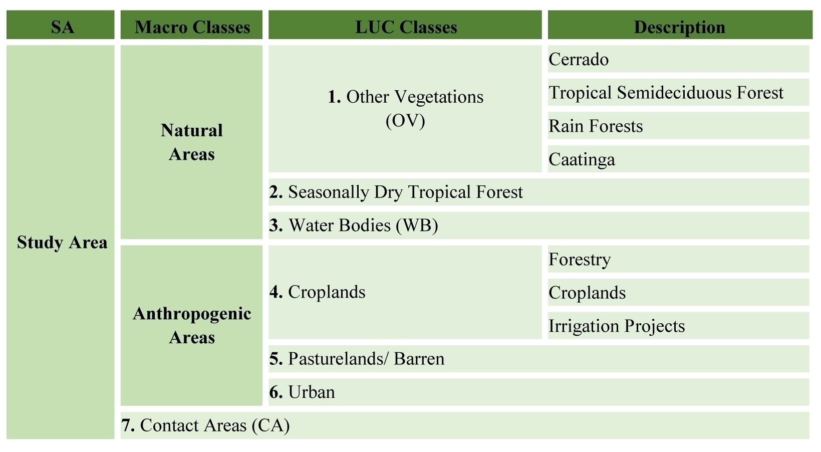 The FOURTH STEP defined the classes of Land Use and Coverage using the Photo interpretation technique to read the satellite images from the parameters (tone/color, texture, shape, size, shadow, and pattern) according to Rosa (2009). This technique was under taken to identify the UCS classes (Table 2) ;which were defined based on the Coverage and Land Use classes presented by the Technical Manual forLand Use (IBGE, 2006) and the concepts of Land Cover and Use reported by Di Gregorio and Jansen (2005). It is important to note that the Contact Areas - CA was not initially proposed as a LUC class.However, the final mapping revealed problems with the spectral discrimination between the Other Vegetation and/or SDTFs. Therefore, this class was used to represent the areas whose specific class could not be clearly identified.