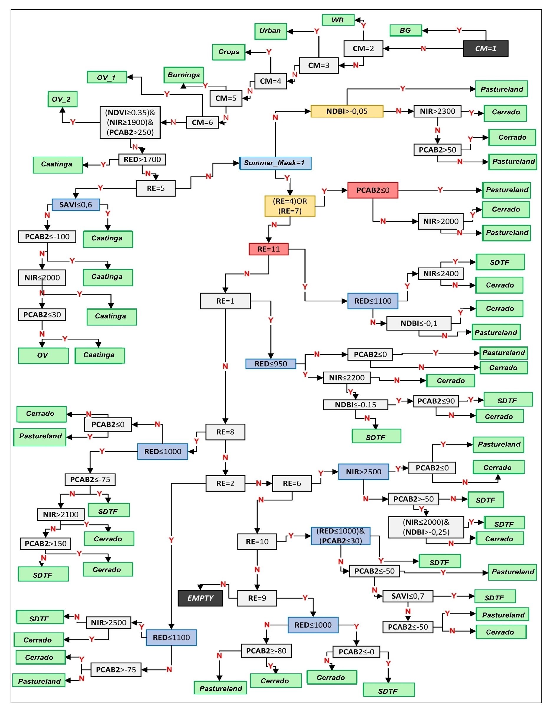 Figure 3 schematically represents the final structure of the decision tree used to identify the LUC classes. At this point, it is pertinent to observe the dynamics of the binary decisions mentioned above,which show that the decision tree is made up of nodes, each of which is a dialog box where the conditioning expressions are computed. As a result, a binary decision is made at each node, which maybe true (yes) or false (no). For continuity, the classification process continues calculating the expressions until all the image’s relevant pixels are correctly classified.