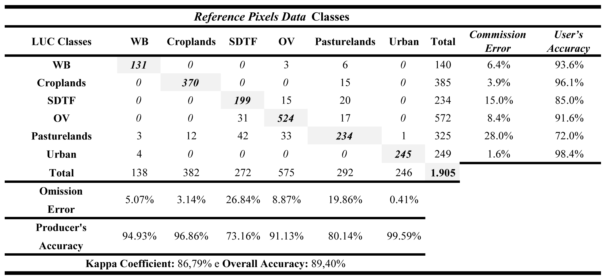 Thus, with the reference points collected in the field and via Google Earth, the Error Matrix of the 2016 classification indicated an Overall Accuracy of 89.40% and a Kappa Coefficient of 86.79%,meaning a high correspondence of the 2016 mapping categories with the reference sample points. Thes estatistics are also justified by the individual averages of the User’s and Producer’s accuracies, which were 89.45% and 89.30%, respectively, and the average of the Omission and Commission errors, at 10.7% and 10.5%. These groups of values were considered positive, as the User’s and Producer’s Accuracy were high, and the Omission and Commission Errors were low.
